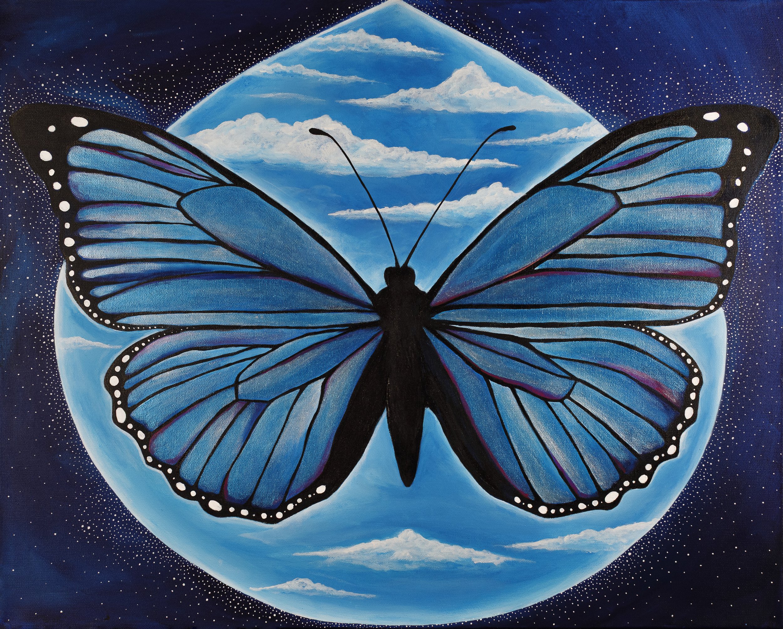 Inspired by the blue bubble meditation, this painting began with the image of a luminous cocoon, a protective field of calm energy. As someone who is deeply empathic, this visualization has helped me to stay centered by creating a gentle energetic boundary. From that cocoon, the butterfly emerged. To me, It became a symbol of resilience. Just as a butterfly transforms within its cocoon, resilience often grows in the spaces where we create safety, stillness and protection for ourselves. My hope is that this piece gently reminds you of your strength and ability to transform.