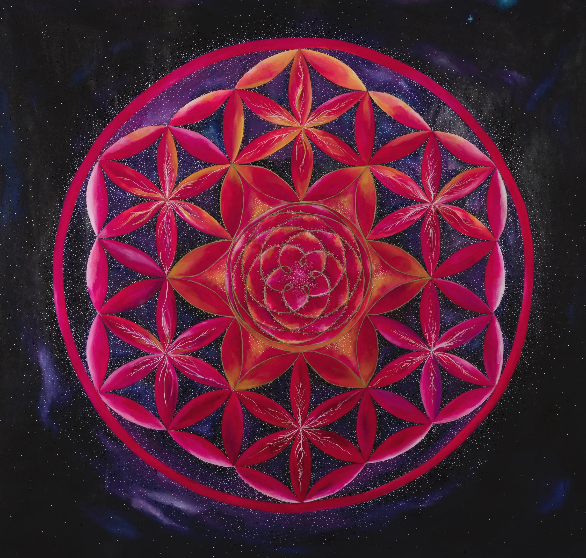 This painting came to life over nine months, as a meditative process rooted in feminine energy, earth connection, and sacred geometry. Inspired by the Rose of Venus, the five-petaled pattern Venus traces in the sky over an eight-year cycle, I worked with themes of grounding, creative flow, and rooted presence. The Flower of Life is subtly embedded in the piece, symbolizing divine order, harmony, and the sacred blueprint of the universe. To me, both the Rose of Venus and the Flower of Life reflect the beauty and intelligence of Source energy, reminders that we are all part of something ancient, rhythmic, and deeply connected. I infused the canvas and paint with rose water and flower essences throughout the process, allowing it to become a visual prayer for embodiment, abundance, and the unfolding mystery of the divine feminine. My intention was to create a painting that represents balance in the lower chakras, and that brings the same sense of joy and inspiration you feel when encountering a vibrant flower in full bloom.