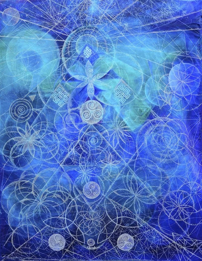 This painting was a nine month meditation and painted prayer. At the time, support felt out of reach, and a mentor gently suggested I create a visual practice, imagining myself at the center and surrounding myself with support. As I painted, it became a way to ground, to center, and to call in what I needed most. Through layers of intention, this piece grew into a symbol of quiet resilience and trust. My hope is that it brings the same sense of comfort and support that emerged for me after its creation, and that when you gaze at it, you feel the same wonder and awe as looking up into a clear night sky.